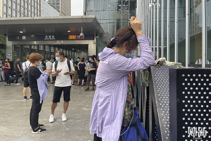 Investors on Tuesday sit at a closed entrance to Houhai station beside Evergrande’s headquarters in Shenzhen. Photo: Guo Xianzhong/Caixin