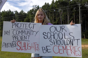 Gretchen Gierlach, a local resident, holds up homemade signs calling for an end to gun violence outside of Apalachee High School in Winder, Georgia, on Wednesday after the shooting took place. Photo: VCG