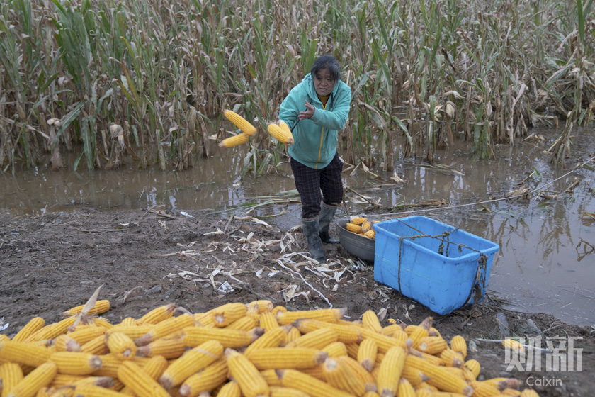 A resident throws harvested corn to the ground Sunday in Louzhuang village. The flood has caused an average 15,000 yuan of loss to each household, village official Zhang Gaoping said. Photo: Liang Yingfei/Caixin