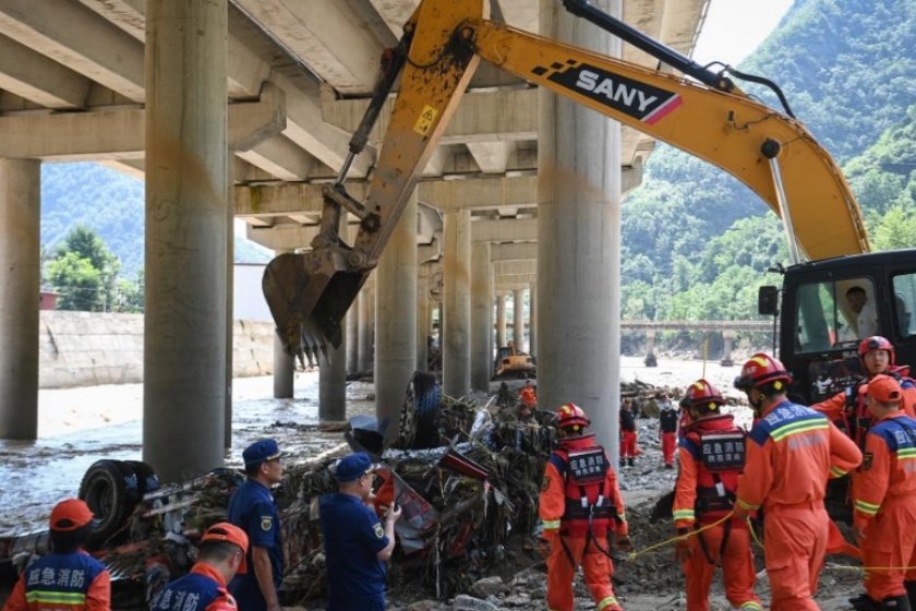 Rescuers search for the 31 missing individuals Sunday. The river’s water level had dropped, allowing them to locate vehicles more easily. Photo: Xinhua