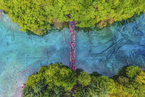 Travelers walk past a bridge in Jiuzhaigou. The local government completed parts of reconstruction work and opened 85% of the reserve to the public in 2019. Photo: IC Photo