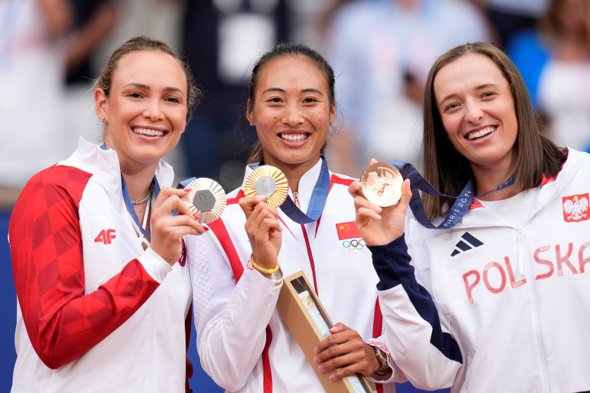 Gold medalist Zheng, silver medalist Vekić and bronze medalist Iga Świątek of Poland pose on the podium after the women’s singles final. Photo: VCG