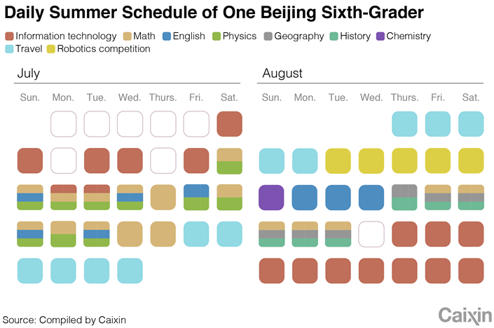 The high intensity training lasts into the summer. Xiao Jing’s parents have planned for their child to focus on his weakest subjects, primarily English. Since Xiao Jing’s dad has a doctorate in computer science, programming lessons are also on the summer syllabus, along with math, physics, and chemistry. Throughout the summer, Xiao Jing’s days end late in the evening. Even during an eight-day stint overseas he doesn’t miss a single online class.
